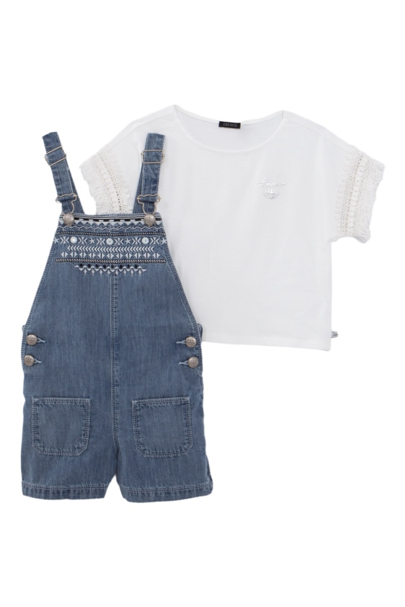 Jardineiras de ganga e t-shirt - Azul e branco - IKKS Júnior