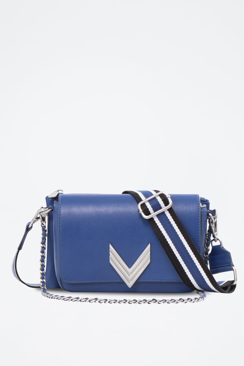 Bolso com zip com estampado às riscas bordado atrás. Fecho com aba magnética.