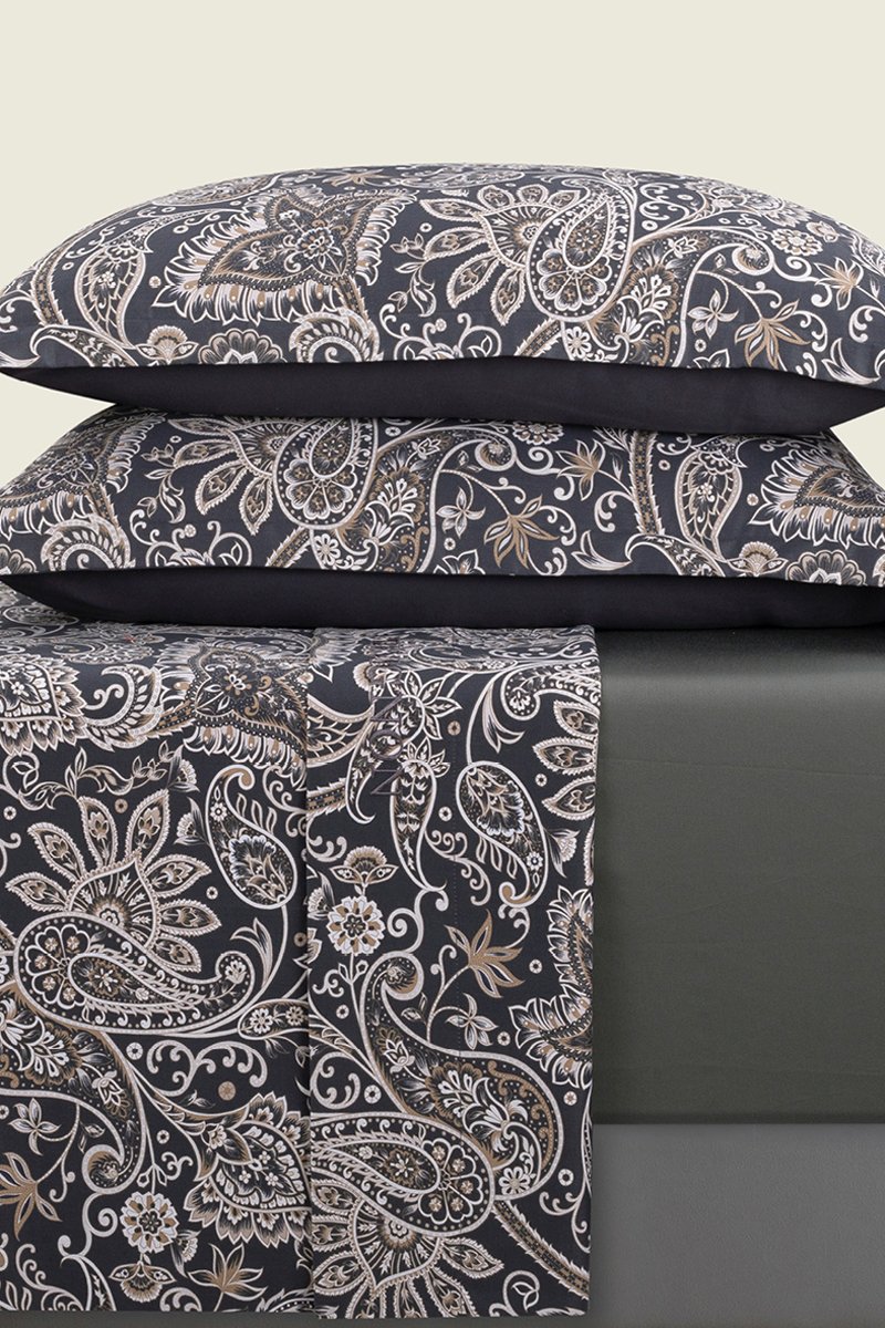 Conjunto de lençóis em cetim de algodão 80 fios/cm² Paisley - Cinzento escuro e branco