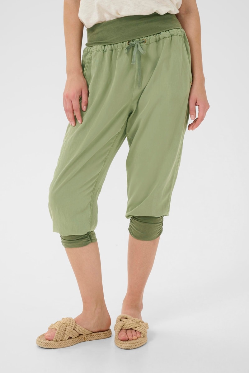 Cintura elástica com atilhos de ajuste.