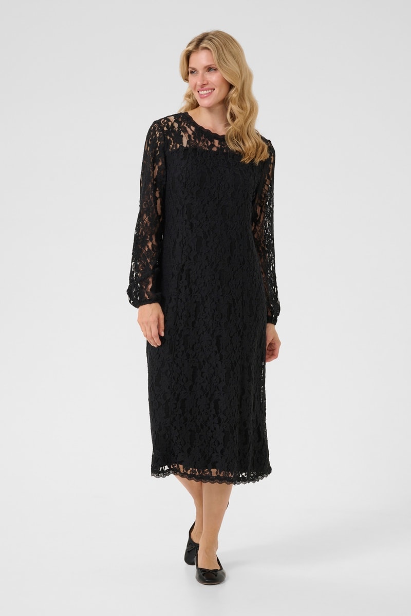 Vestido direito em renda de mangas compridas.