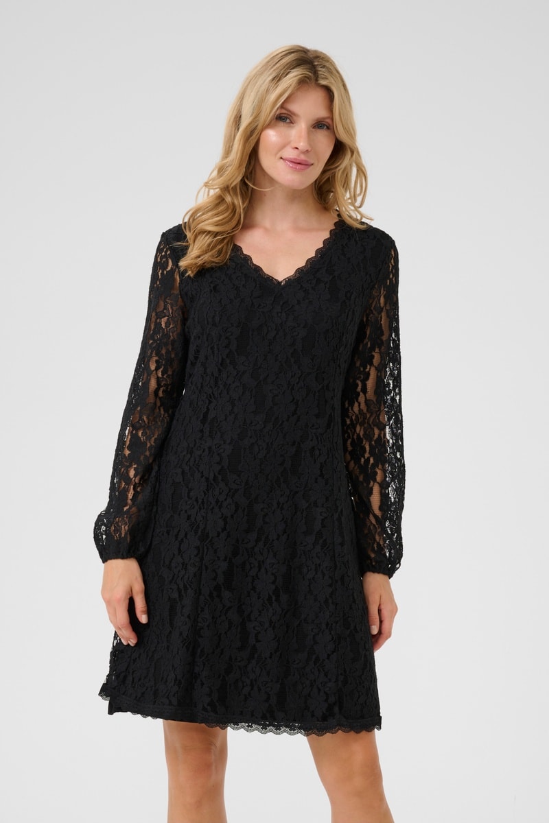 Vestido trapézio em renda de mangas compridas.