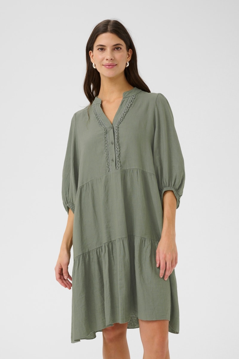 Vestido com folhos em linho misturado de mangas 3/4 volumosas.