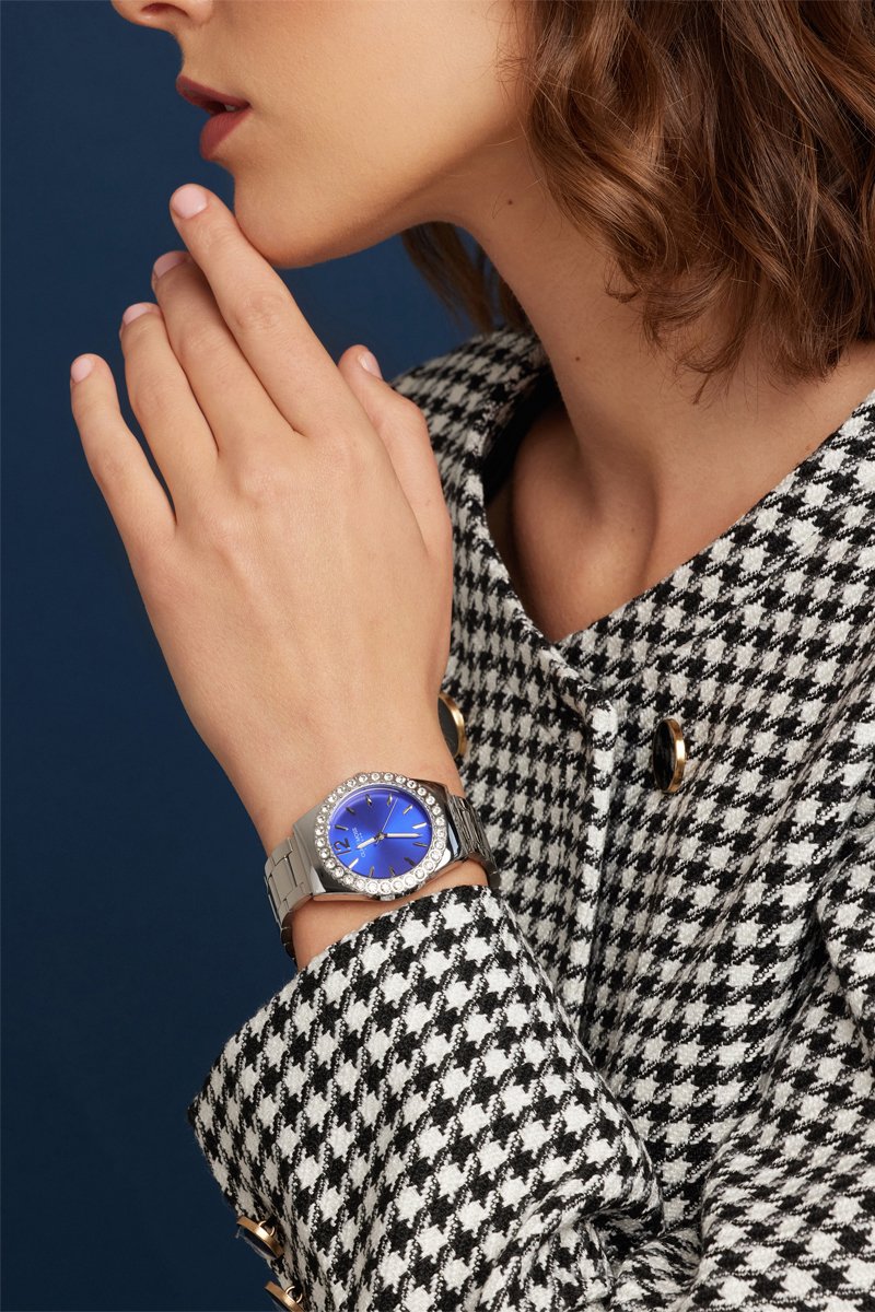 Relógio de quartzo em aço e zircões Opera - Prateado e azul