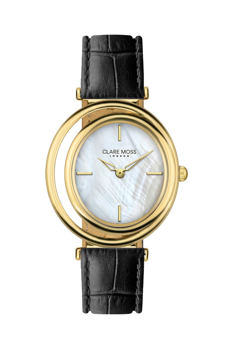 Relógio de quartzo em couro de vitela e madrepérola Clare Pearl - Preto e dourado