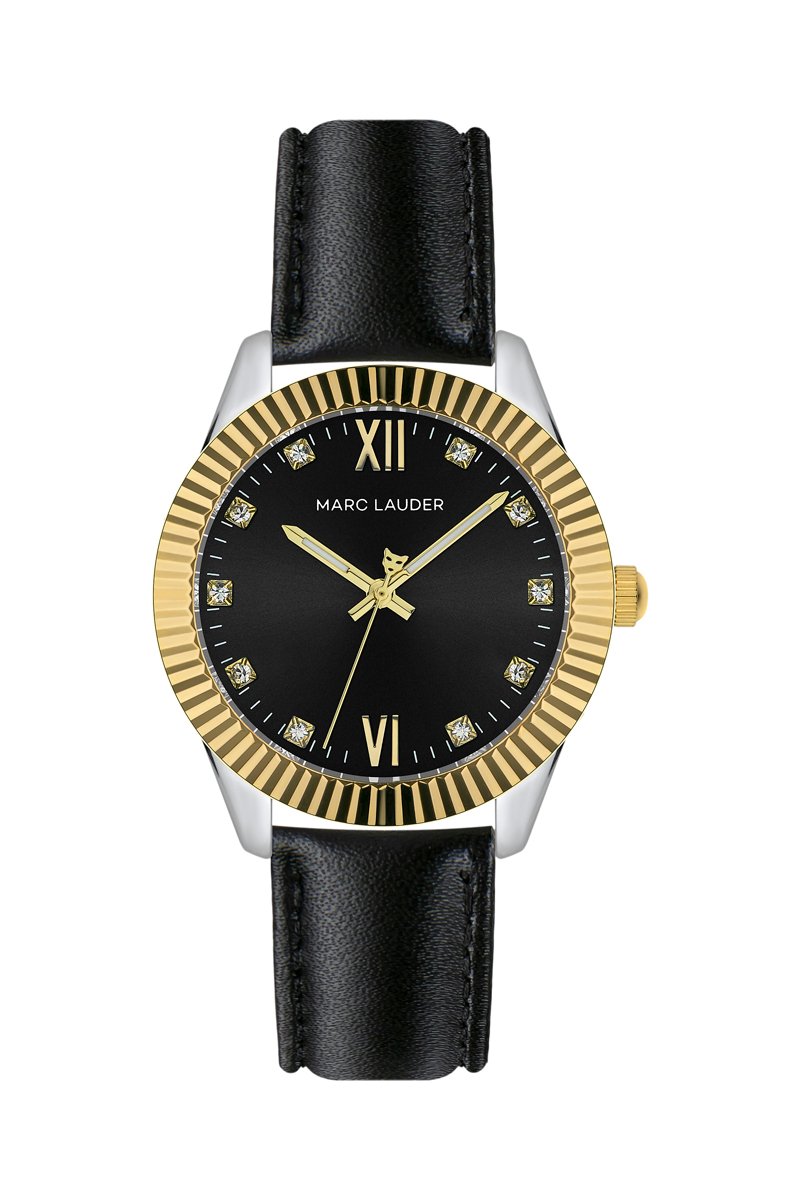 Relógio de quartzo em couro e zircões Edinburgh - Preto e dourado