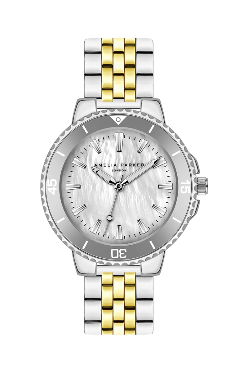 Bracelete de elos em aço inoxidável. Mostrador com madrepérola.