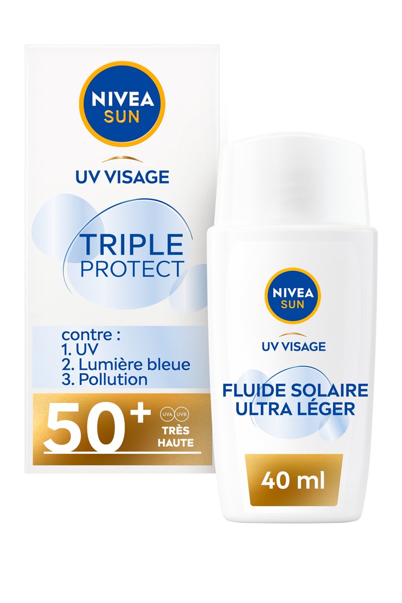 Este fluido solar facial de tripla proteção FPS 50+ NIVEA Sun protege a pele diariamente contra as agressões externas, tais como os raios UV, a luz azul e a poluição.