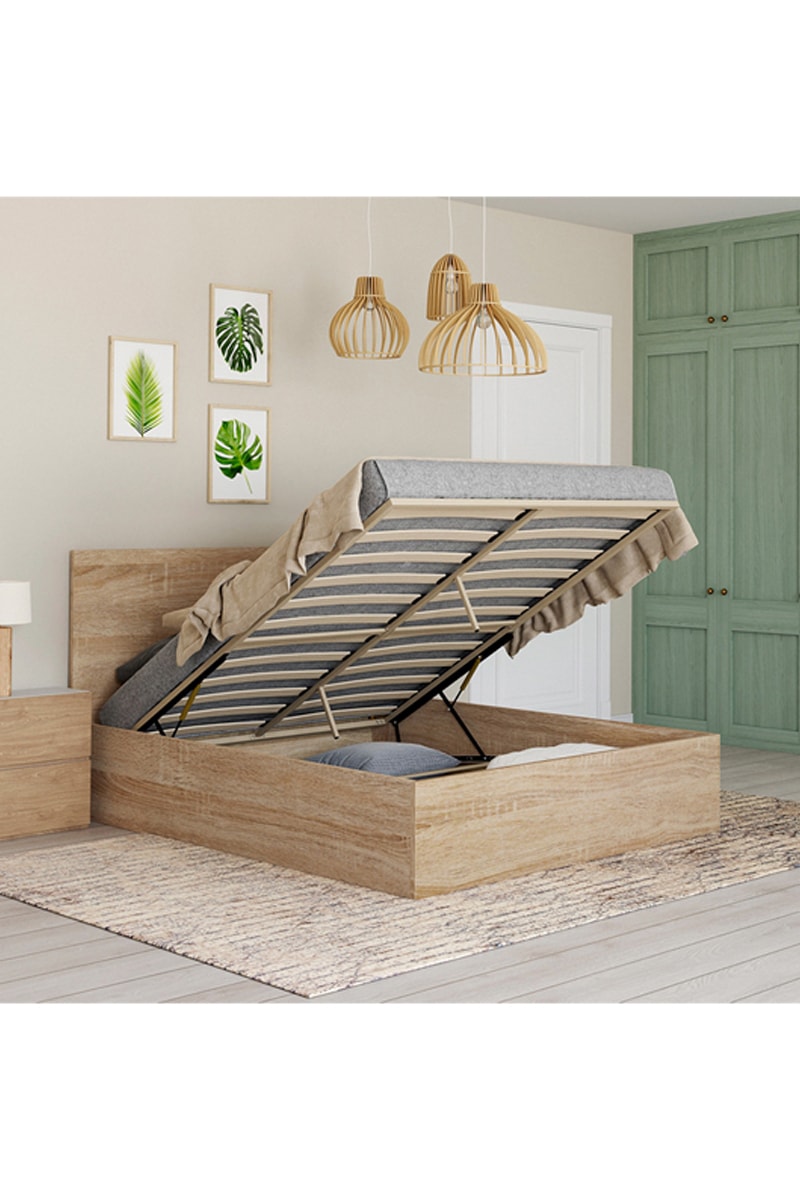 Cama com arrumação Sicilia com sommier e cabeceira de cama efeito madeira 140x190cm