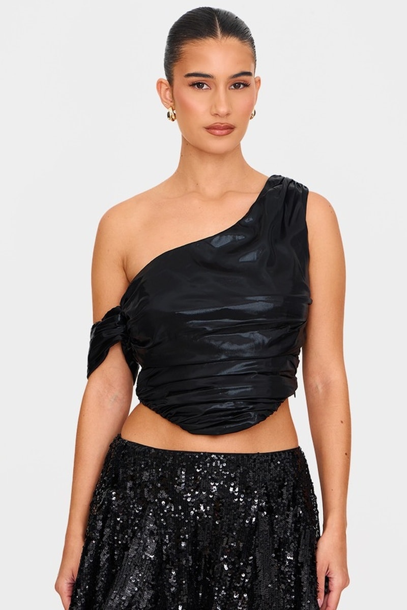 Sem manga do lado direito e manga curta do lado esquerdo.