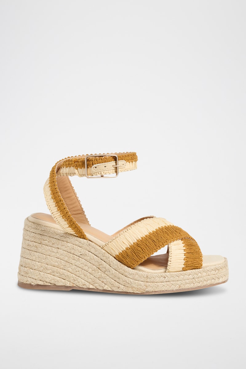 Sandálias com cunha em ráfia. Fecho com tira de fivela.