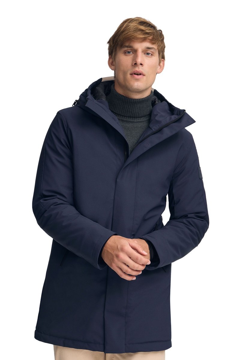 Parca com capuz com atilhos de ajuste e travão de cordão.