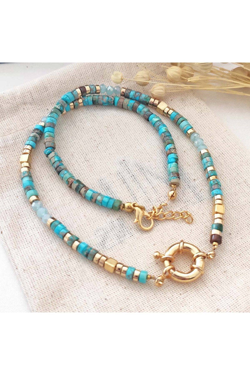 Colar de pedras & de pérolas turquesa - Latão banhado a ouro
