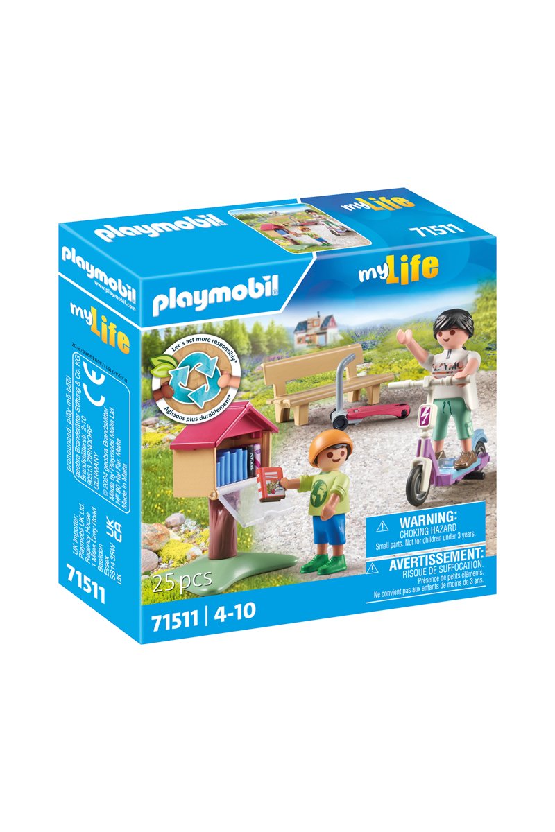 25 acessórios incluídos tais como: figuras, trotinetes elétricas e clássicas, recipiente, caixa de livros com pé, livros.