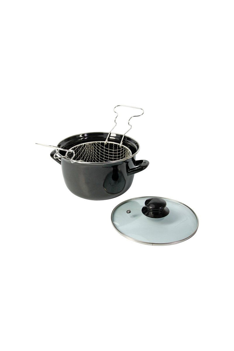 Fritadeira em aço esmaltado com tampa válvula anti-embaciamento e cesto estanhado.