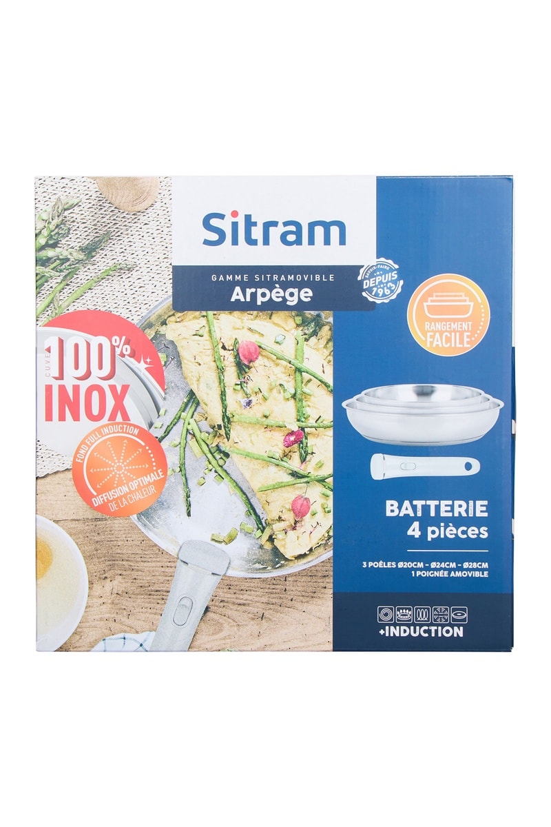 3 frigideiras em aço inoxidável e 1 cabo amovível - 20, 24 e 28 cm