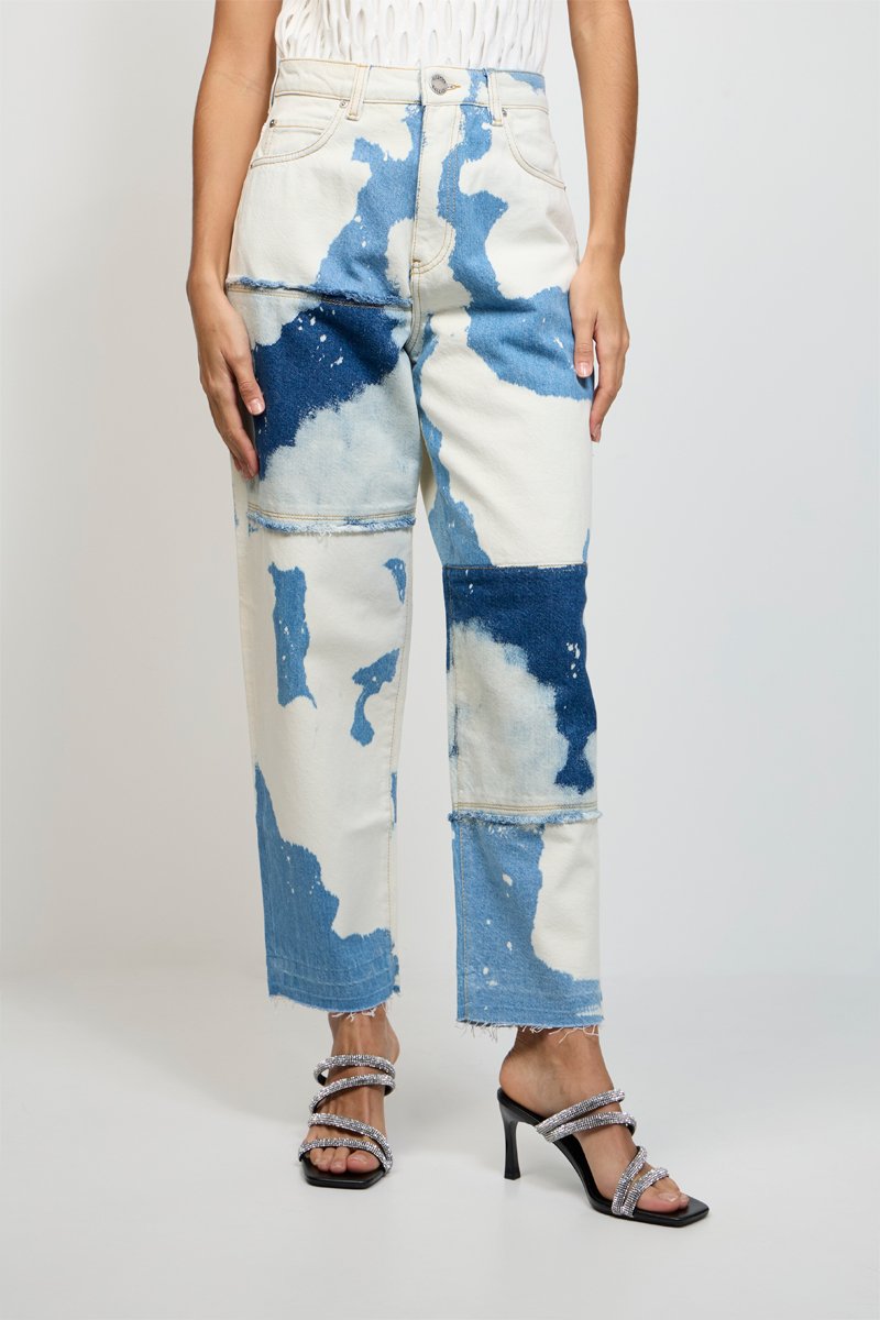 Calças de ganga cintura subida - Branco e azul-marinho