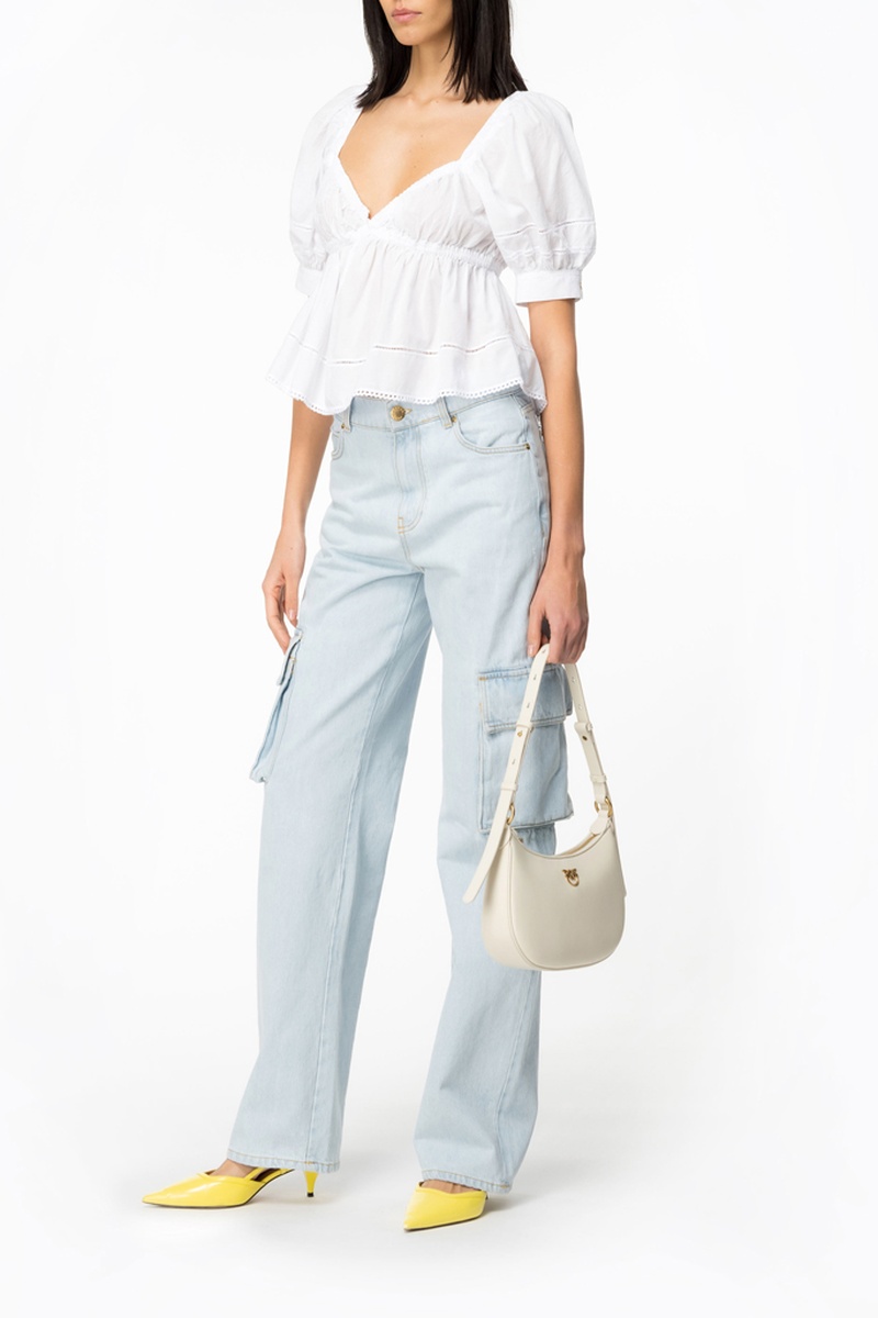 Top de linho de mangas curtas abotoáveis e volumosas.