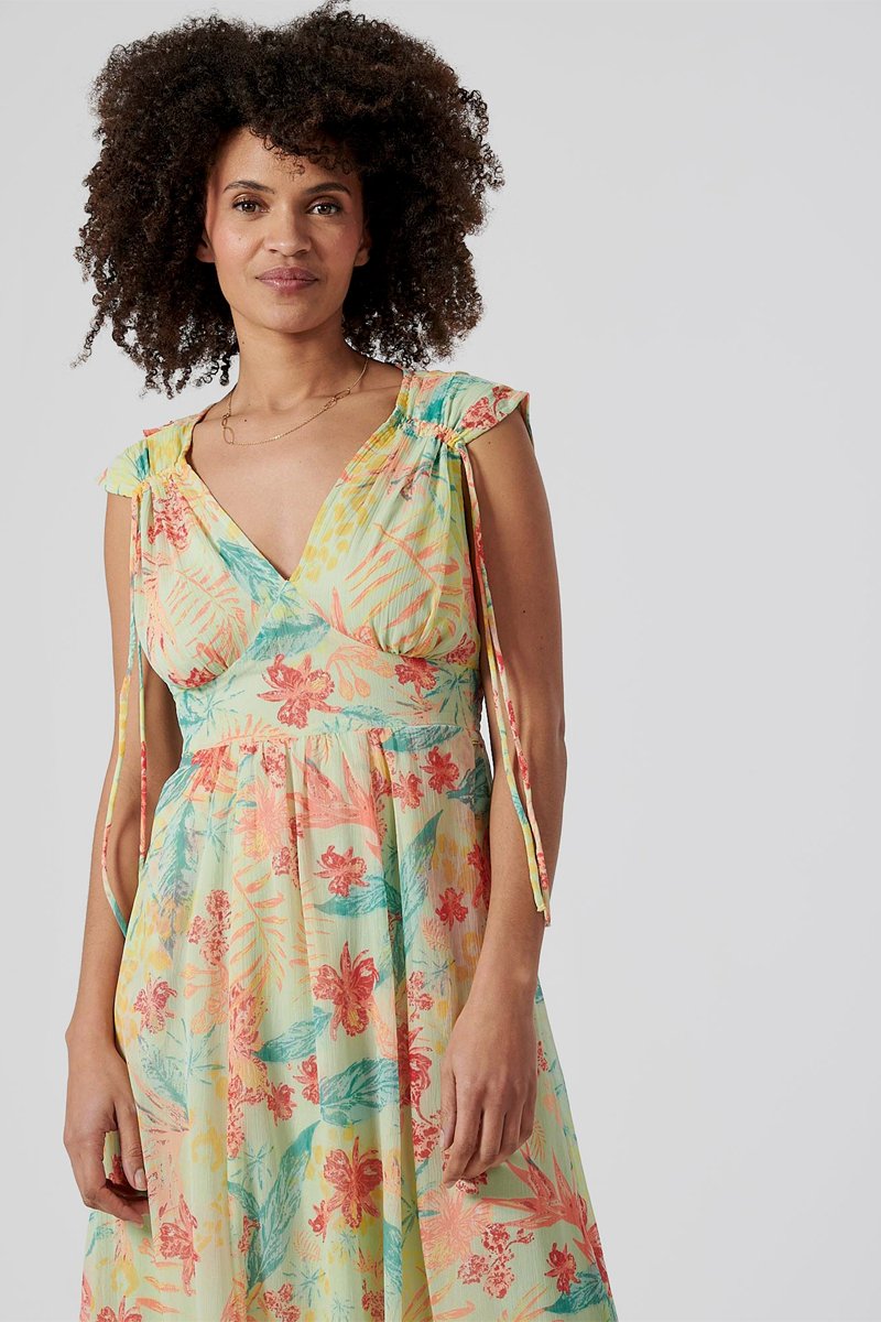 Cor: amarelo-pálido, verde-claro, coral e azul turquesa