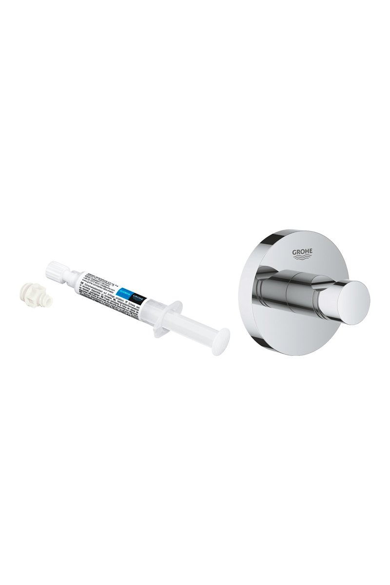 Pode ser aparafusado à parede (parafuso e bucha incluídos) ou colado (cola GROHE Quickfix A1 41 127 000 vendido separadamente).