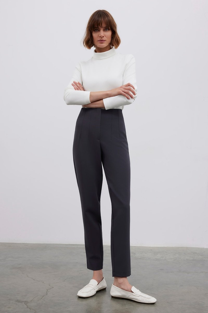 Calças de cintura subida.
