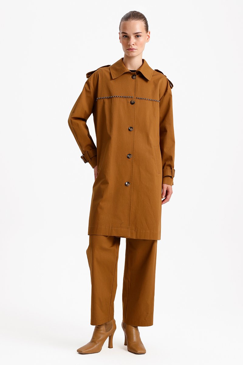 O modelo mede 1,79 m e veste o artigo no tamanho 38.