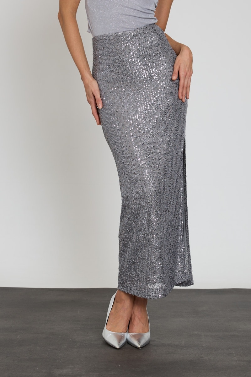 Saia comprida com lantejoulas.