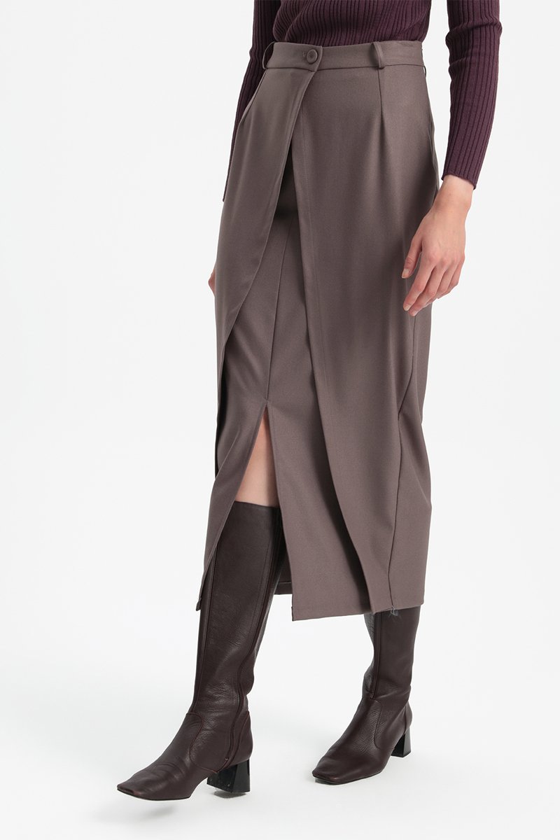 Fecho de botão à frente e de zip de lado.