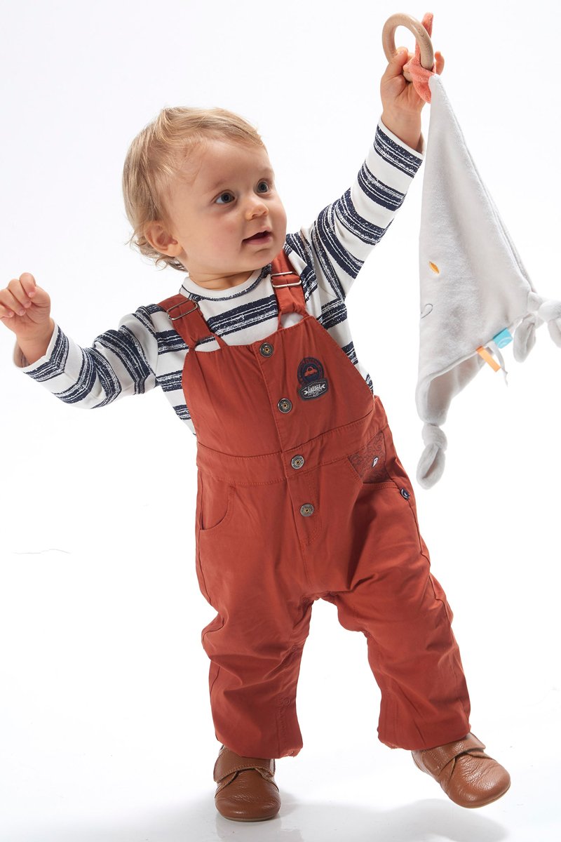 T-shirt e jardineiras - Vermelho-tijolo - Branco, bege, vermelho e azul