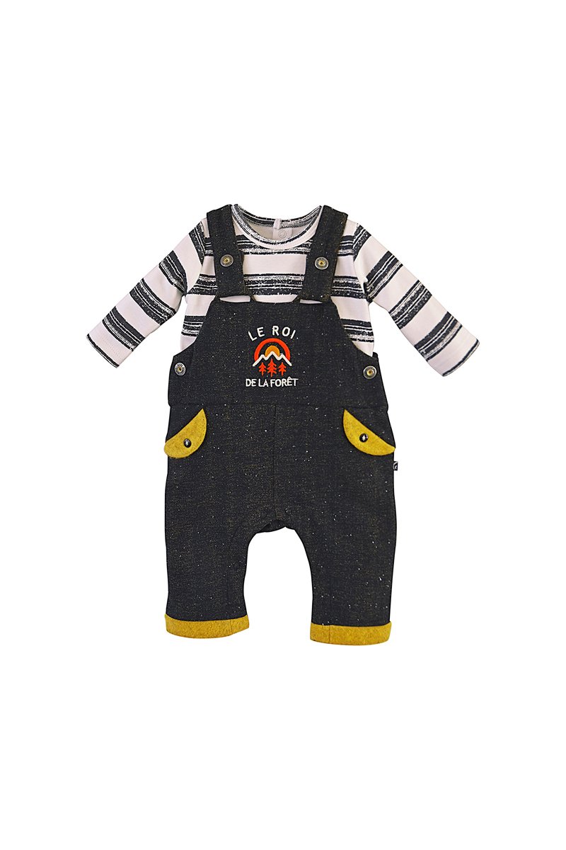T-shirt e jardineiras - Cru e antracite mesclado - Branco, amarelo, laranja e cinzento