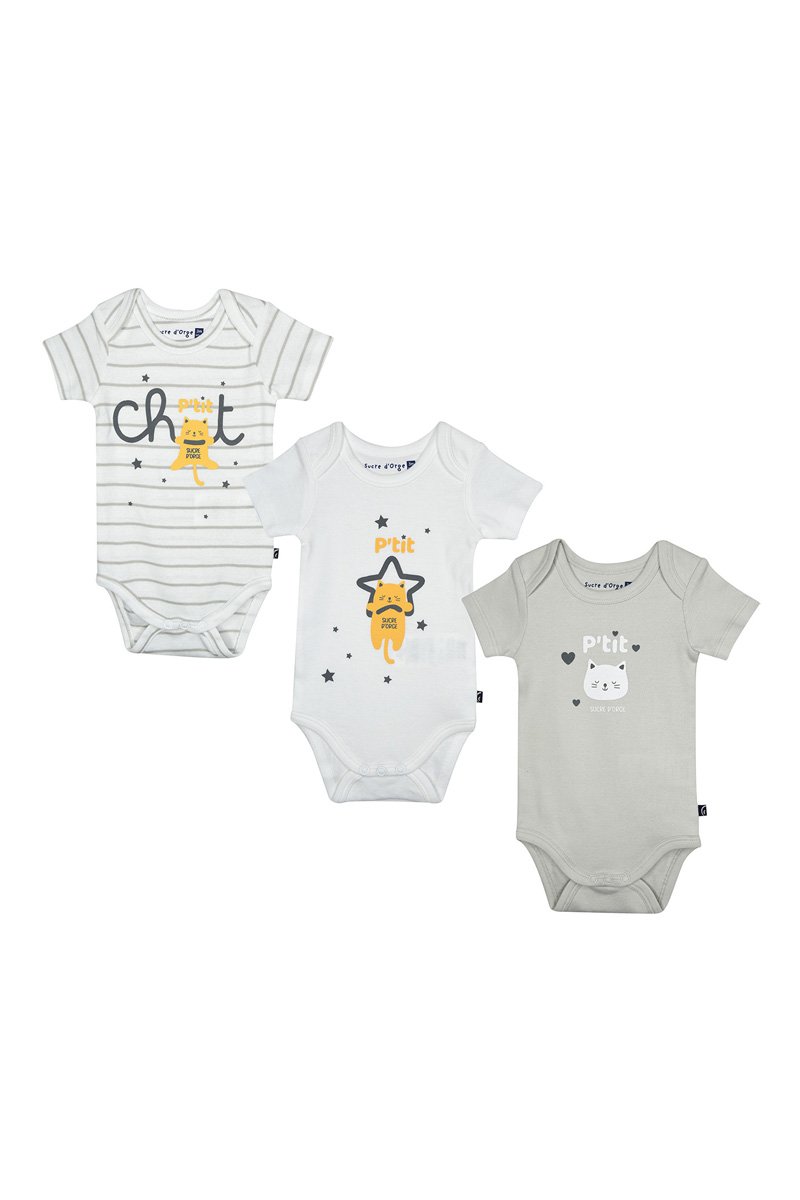 1 com estampado às riscas e inscrição, estampado de estrelas, gato e logótipo à frente.