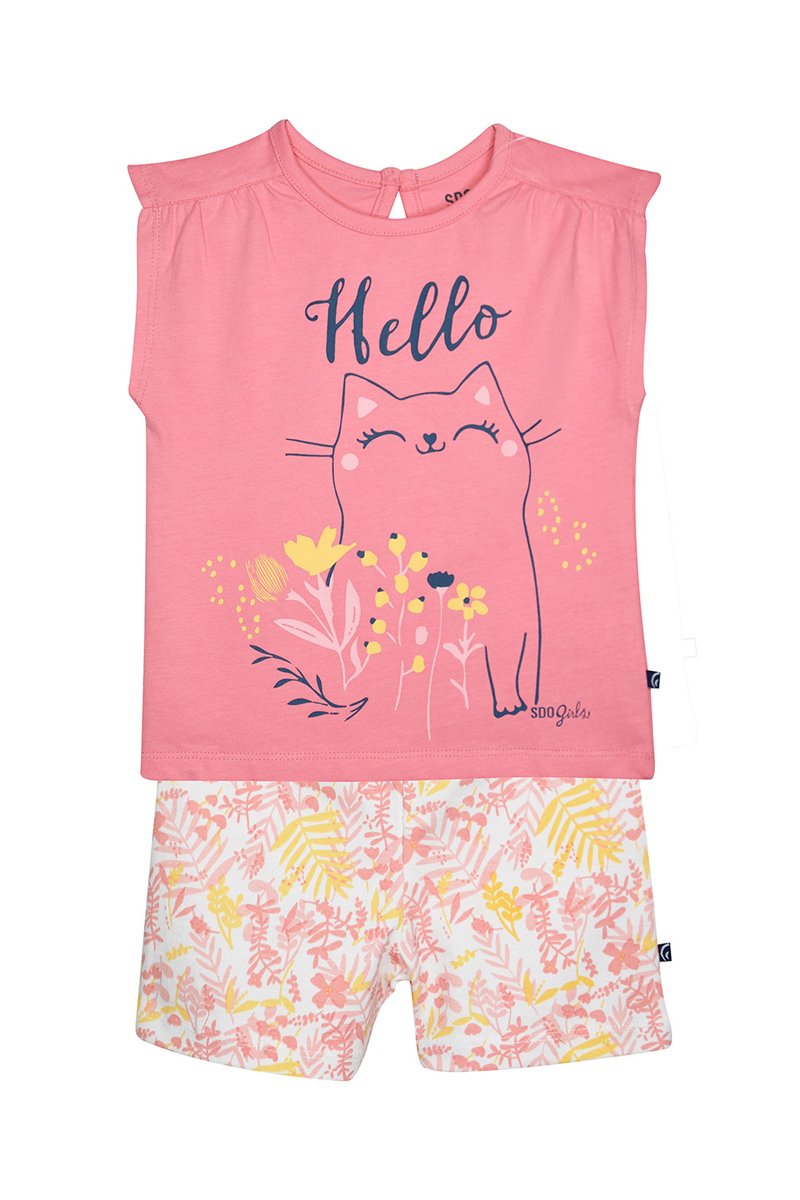 Inscrição, logótipo, estampado de gato e flores à frente.
