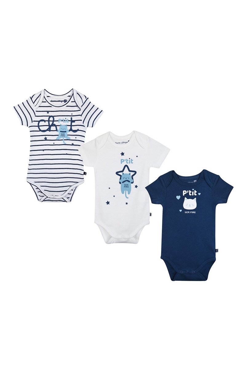 1 com estampado às riscas e inscrição, estampado de estrelas, gato e logótipo à frente.