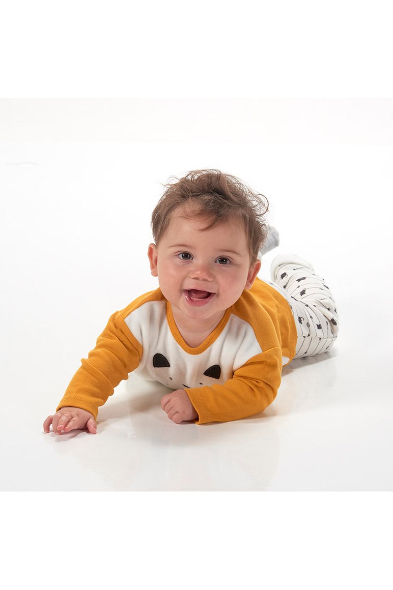 T-shirt e calças - Cru e mostarda - Branco, preto e amarelo