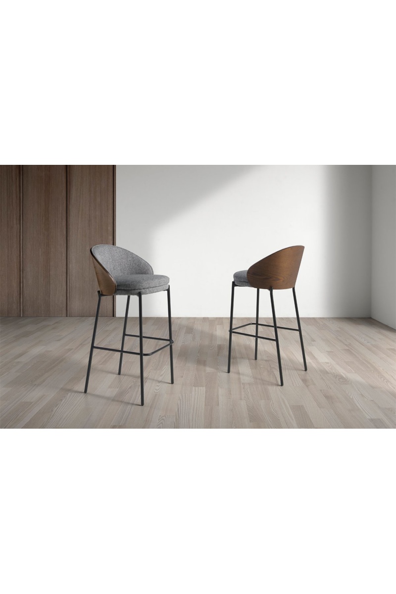 Composição: tecido, placado nogueira, aço Inoxidável e espuma de poliuretano 25 kg/m³