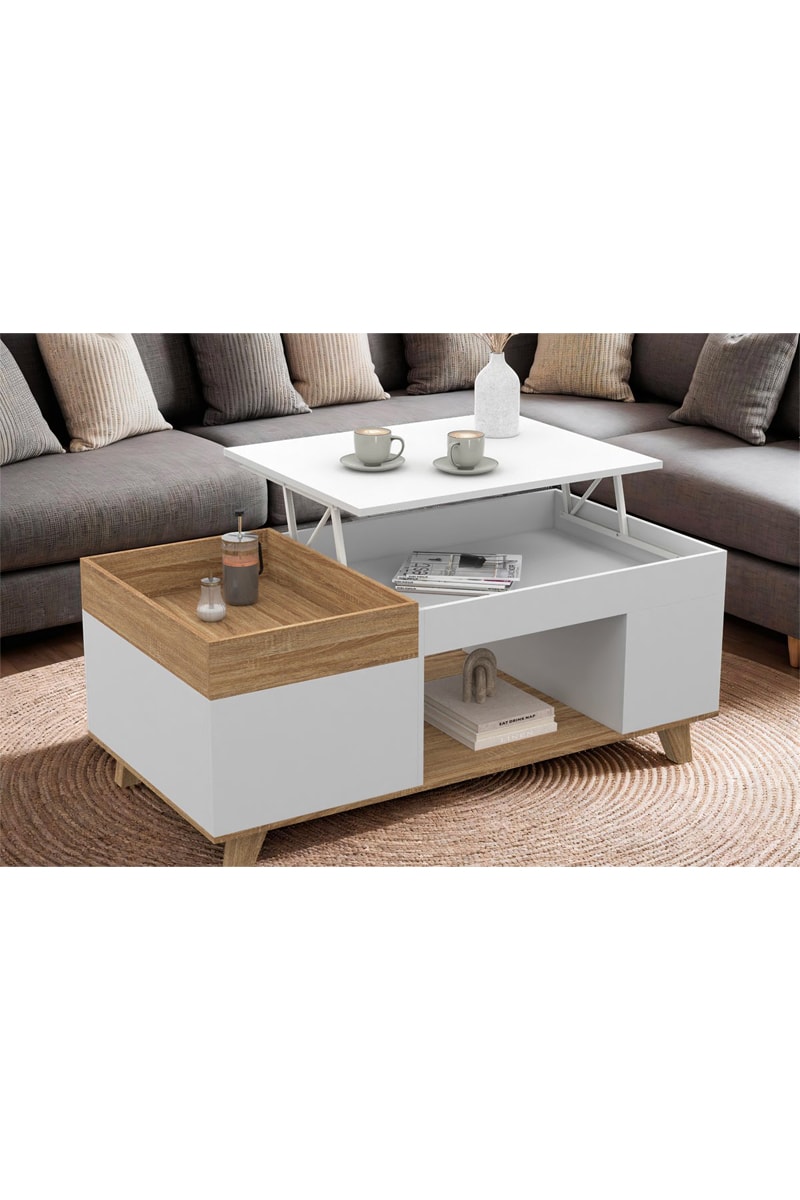 Mesa de centro ajustável Elina - Imitação de madeira e branco