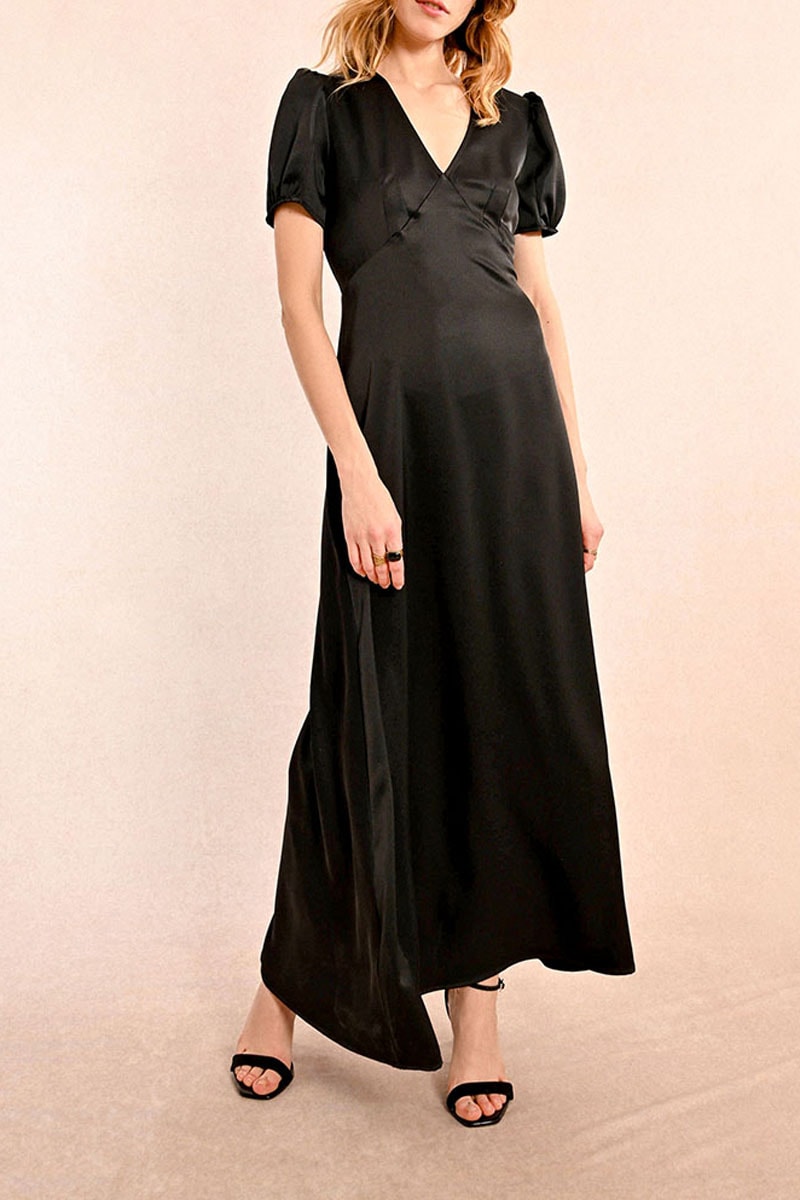 Vestido comprido de mangas curtas volumosas.