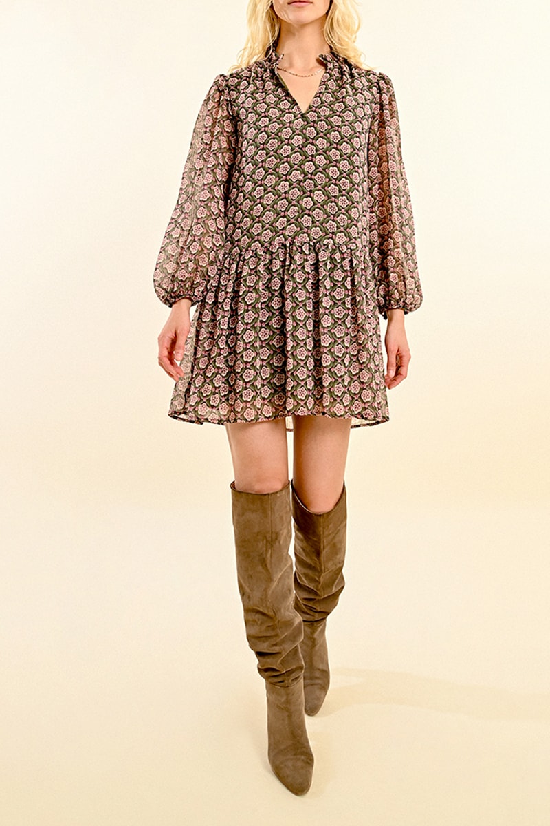 Vestido estilo patinadora de mangas compridas volumosas elásticas.