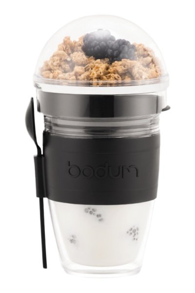 Dupla parede permite manter o leite e o iogurte frescos até que esteja pronto para comer.