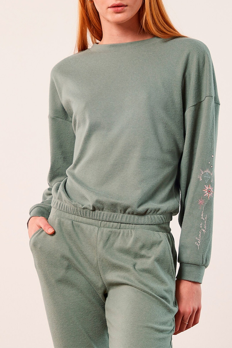 Sweat com mangas compridas 1 das quais com inscrição e padrões decorativos.