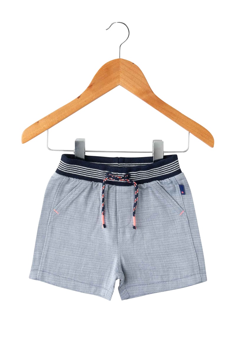 Cintura elástica com estampado às riscas e atilhos de ajuste.