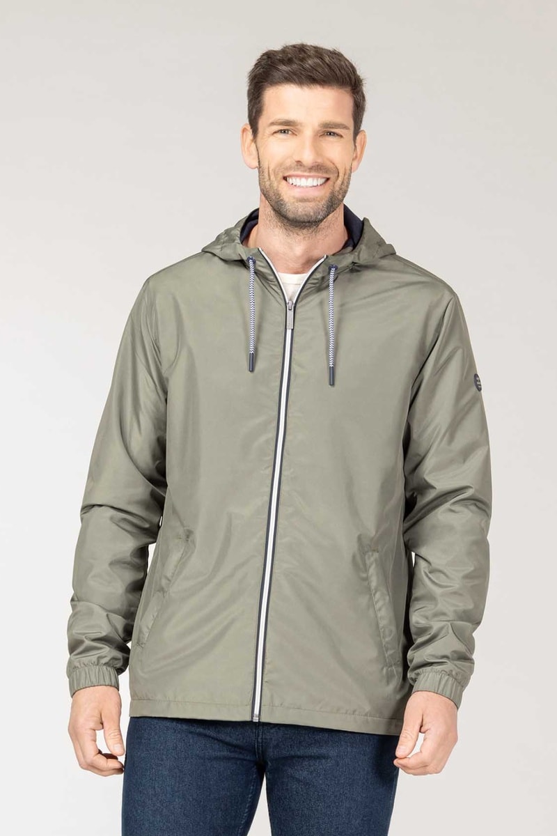 Corta-vento com capuz e atilhos de ajuste.