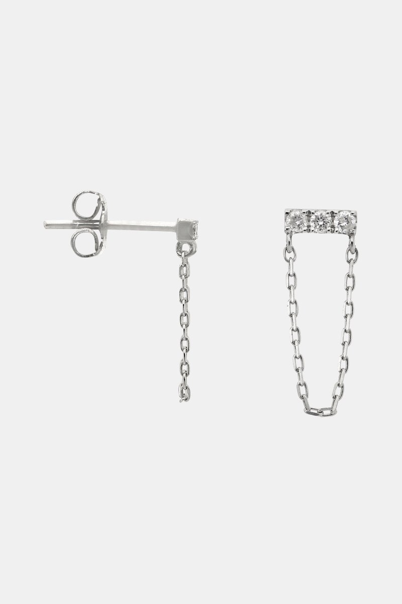 Brincos de ouro branco com 6 diamantes e corrente.