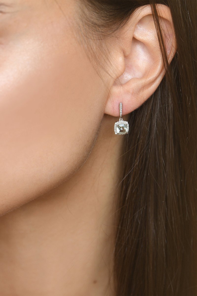 Brincos em ouro branco com 30 diamantes e uma aventurina.