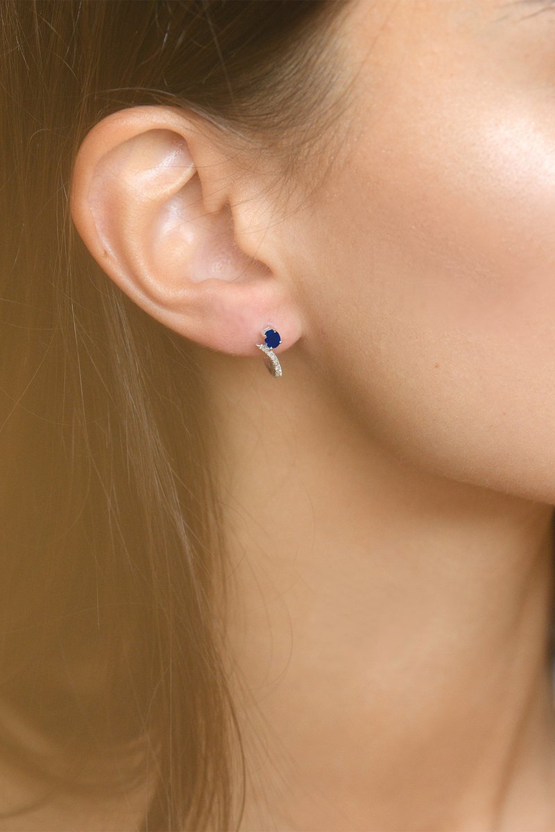 Brincos de ouro branco com 9 diamantes e uma safira.