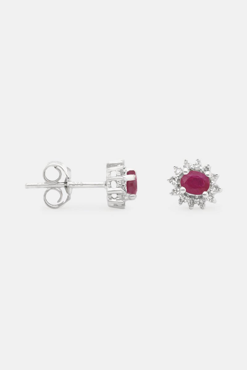 Brincos em ouro branco com 12 diamantes e um rubi.
