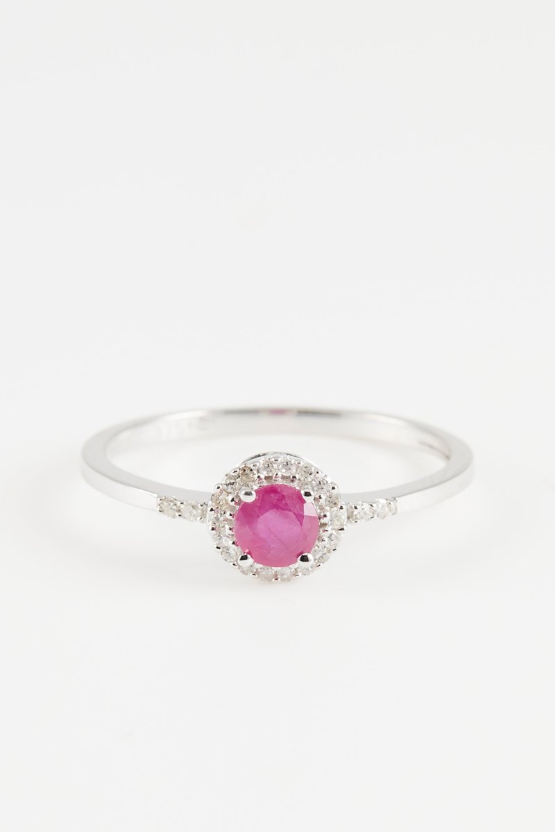 Anel em ouro branco com 22 diamantes e un rubi.