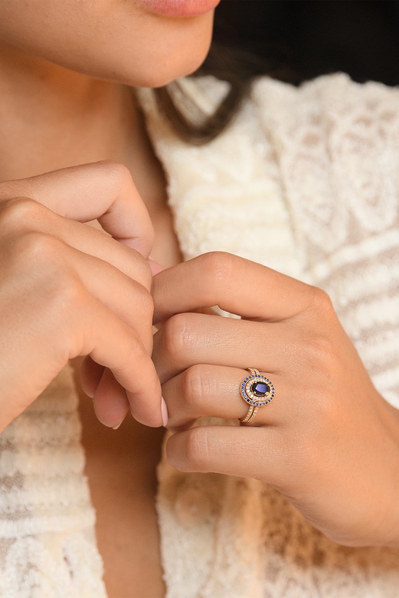 Anel em ouro amarelo com 50 diamantes e 29 safiras.