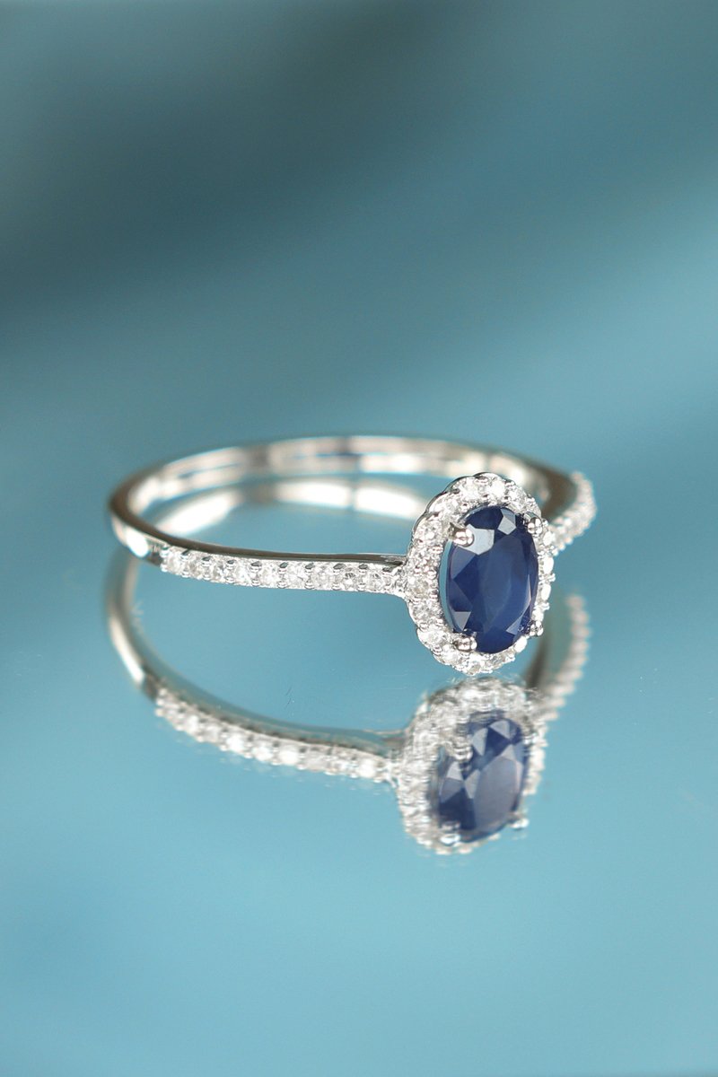 Anel em ouro branco com 36 diamantes e uma safira.