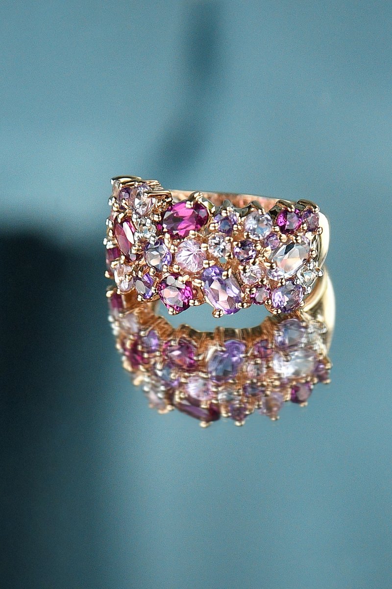 Anel em ouro rosa com 11 ametista, 7 rodolitas, 4 safiras e 4 topázios.